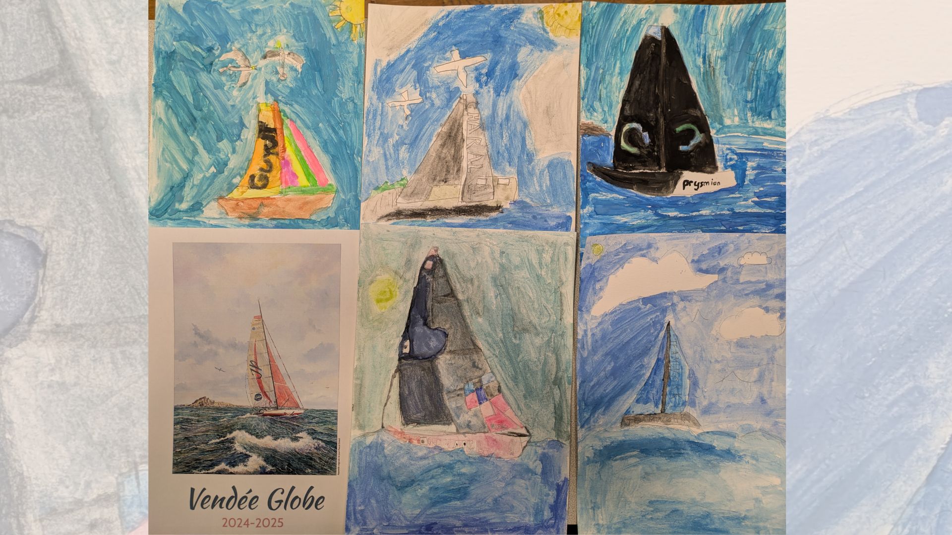 Les CE1-CE2 ont découvert l’aquarelle « Au coeur des océans » réalisée à l’occasion du Vendée Globe 2024-2025 pour l’affiche de l’évènement par Jean-Pascal Duboil, artiste des Sables-d’Olonne. Ils ont ensuite pu réaliser leur propre aquarelle, inspirée de celle de l’artiste.