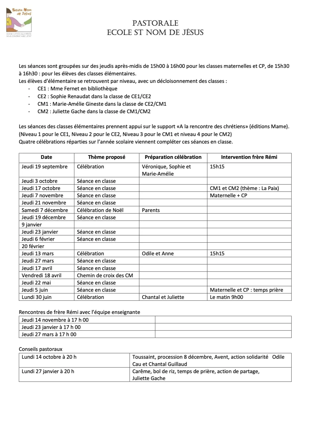 Vous serez conviés à des temps de célébration, à l’Eglise, en fonction des temps forts de l’année liturgique, et de la vie de notre école. En lien avec la Paroisse, l’éveil de la Foi et la catéchèse sont l’affaire de tous. L’équipe enseignante s’investit avec conviction dans la pastorale. Afin d’offrir des temps de partage et de réflexion en petits groupes, nous avons besoin de vous : parents, grands-parents… Si vous n’avez pas le temps suffisant et que ce sujet vous intéresse, faites-vous connaître. Si vous hésitez, ou n’osez pas, vous pouvez venir voir la direction. Il y a mille façons de se rendre utile et de témoigner de sa foi.